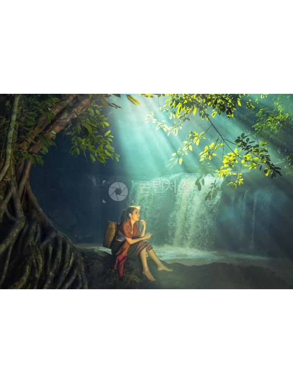 • 해외 여자모델 아시아 폭포 나무 신비로운 소녀 베트남 태국 인도네시아 미얀마 앉아있는 전통적인 미소녀